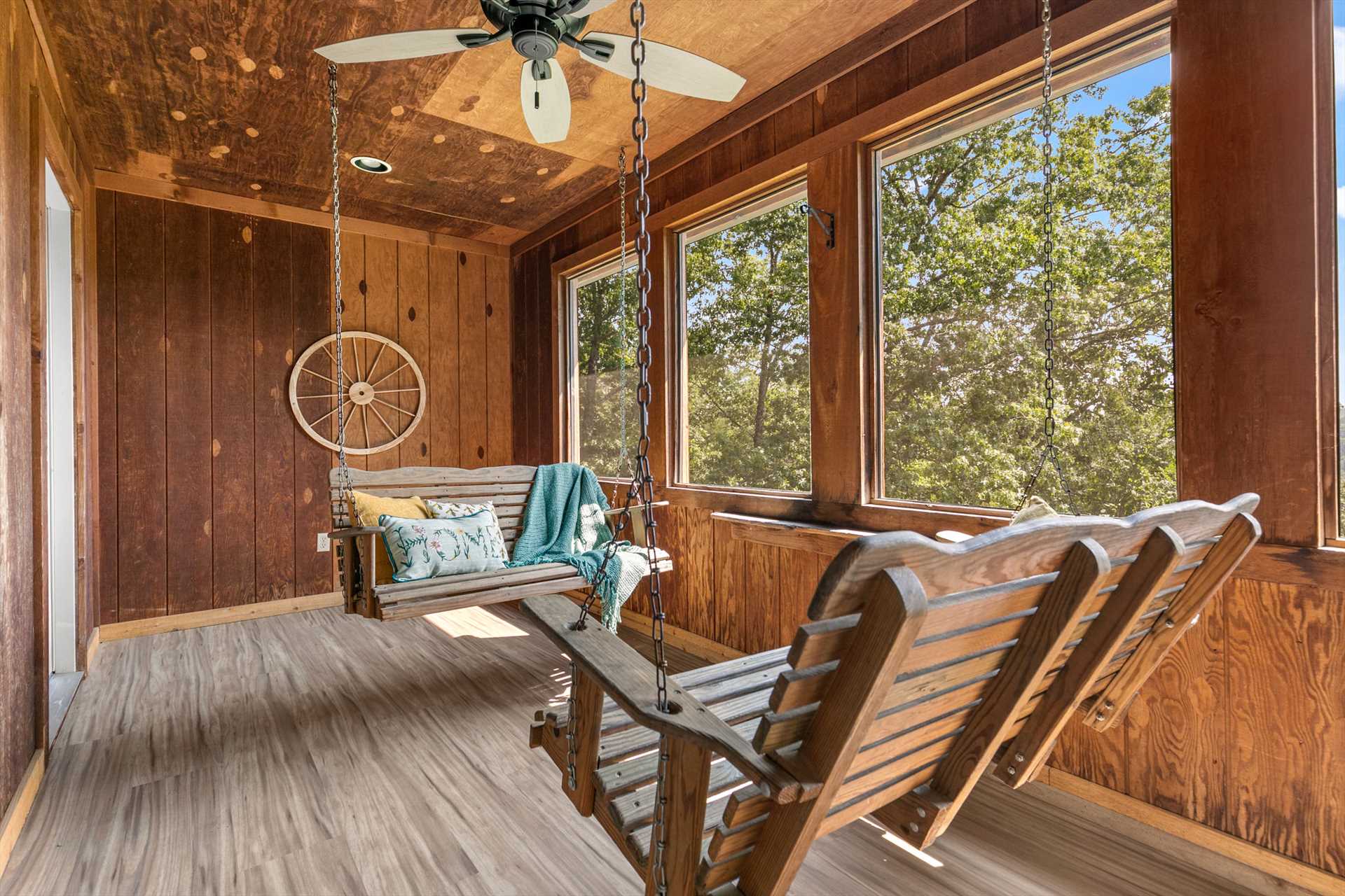 We just got back home and had a wonderful stay at this cabin. It is so roomy!! There were only 4 of us but could sleep so many more. The beds were beyond comfortable. The cabin was extremely clean. Kitchen was well stocked had everything you could need, even a bowl with snacks to welcome you! I can only imagine how gorgeous it is in the fall. Back porch has 2 swings and amazing views. The owners were so quick to reply to all questions. I would suggest they leave some instructions for the fireplace and tv's. Note:fireplace is electric. It looks like a blazing fire in the pictures. It did not take away from our trip. There are steep stairs to get to bottom level if you have small children or elderly. I would highly recommend this cabin, especially if you are going to Silver Dollar City and want a more peaceful, quiet stay.